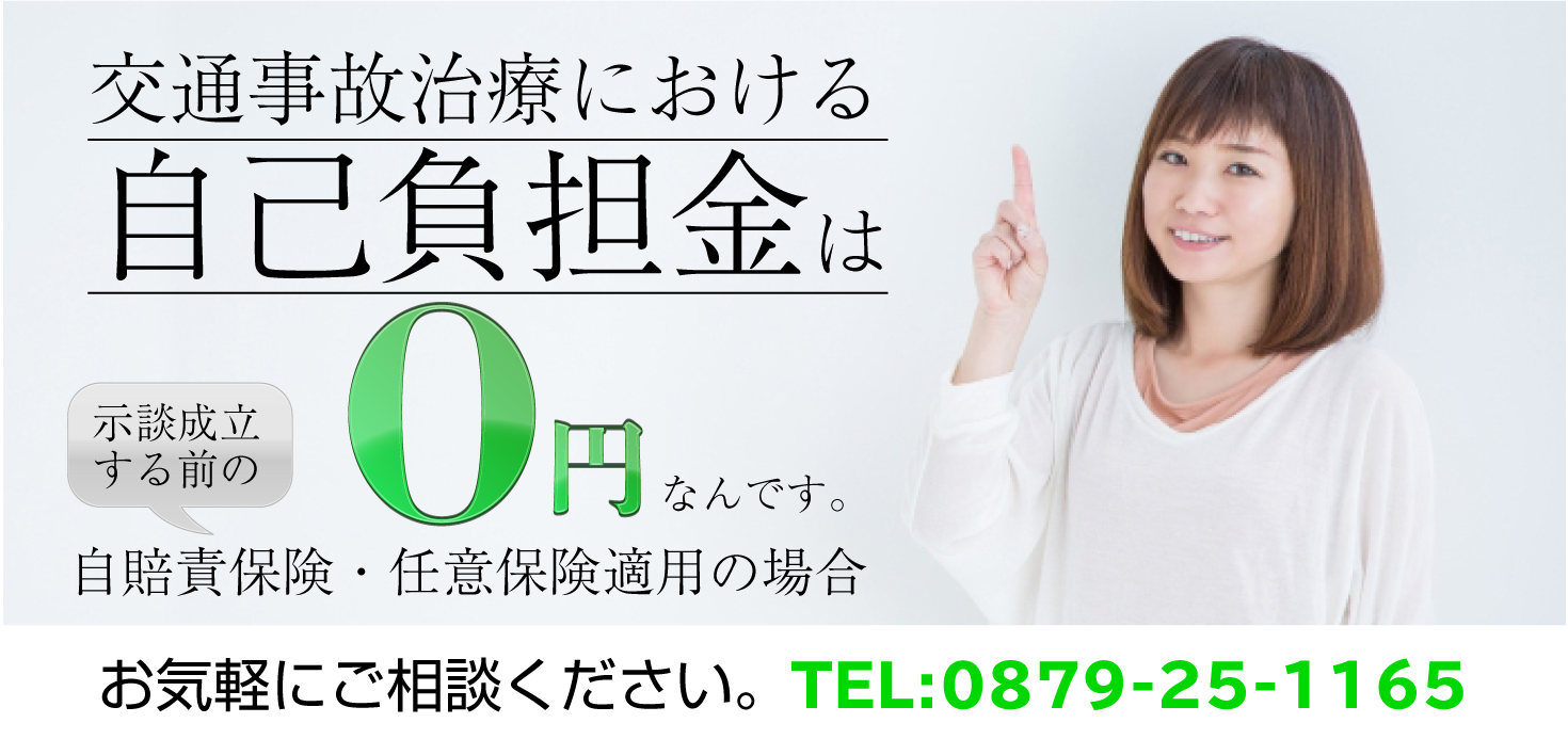 自賠責保険適用の場合かかる費用は0円。整形外科との併用も可能です。